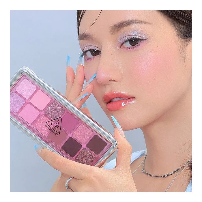 3CE's NEW TAKE Edition eyeshadow palette, featuring eye-catching frame-like packaging and offering 12 shades of clear and glittery colors for an easy layering color. It provides various fancy eye makeup looks with different textures including soft matte, creamy shimmer, sparkling, and metallic glitter, making it versatile for multiple uses like eyeshadow, eyeliner, eyebrow, blusher, highlighter, and contouring. Its formula allows for soft blending, seamless adherence, and a long-lasting flawless finish without clumps or creases.