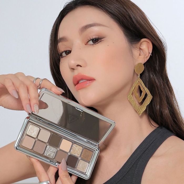 3CE's NEW TAKE Edition eyeshadow palette, featuring eye-catching frame-like packaging and offering 12 shades of clear and glittery colors for an easy layering color. It provides various fancy eye makeup looks with different textures including soft matte, creamy shimmer, sparkling, and metallic glitter, making it versatile for multiple uses like eyeshadow, eyeliner, eyebrow, blusher, highlighter, and contouring. Its formula allows for soft blending, seamless adherence, and a long-lasting flawless finish without clumps or creases.