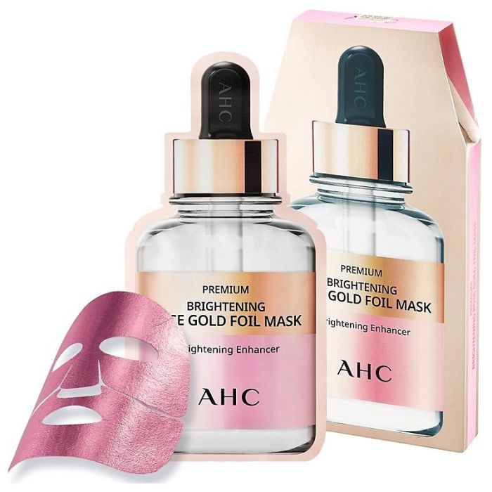 AHC Premium Brightening Rose Gold Foil Mask, designed to provide brightening and nourishing benefits to the skin with its rich serum and key ingredients. The unique rose gold foil layer retains moisture, enhances serum absorption, and adds a touch of luxury to your skincare routine.