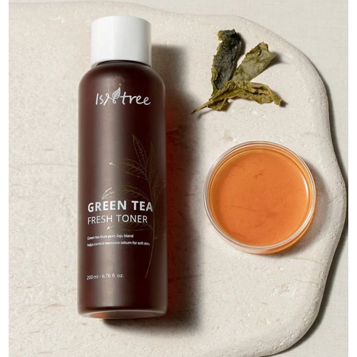The isntree Green Tea Fresh Toner is a hydrating daily toner, containing 80% fresh green tea from Jeju Island, infused with Anti Sebum P (HD) to absorb excess sebum, suitable for oily/combination skin, and dermatologically tested for soothing, revitalizing, and clearing tired skin.