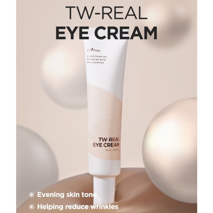 Isntree's TW-Real Eye Cream, now in new packaging, enriched with 61% highly concentrated bifida fermented lysate to combat fine lines and dark circles, improve skin elasticity, and reduce discoloration and dullness. Its versatile formula allows you to also target forehead, smile lines, and neck wrinkles with no irritation concerns.