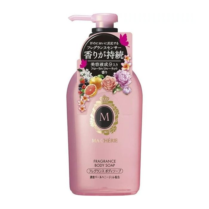A body soap with Ma Cherie's unique fragrance sensor function that provides a comfortable scent and moisture luster every day, featuring a sweet and refreshing floral fruity scent that lasts and a dense Pearl Honey Jure BX formulation for moisturizing the skin.