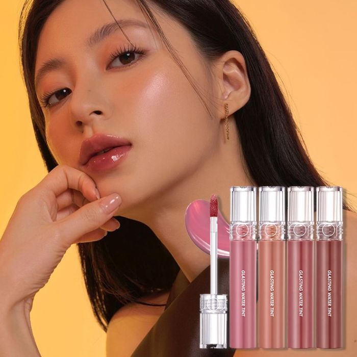 Rom&nd's Glasting Water Tint #Sunset, a glossy lip tint with versatile shades that deliver a glassy shine, light texture, and comfortable moisture for long-lasting, vivid color without stickiness.