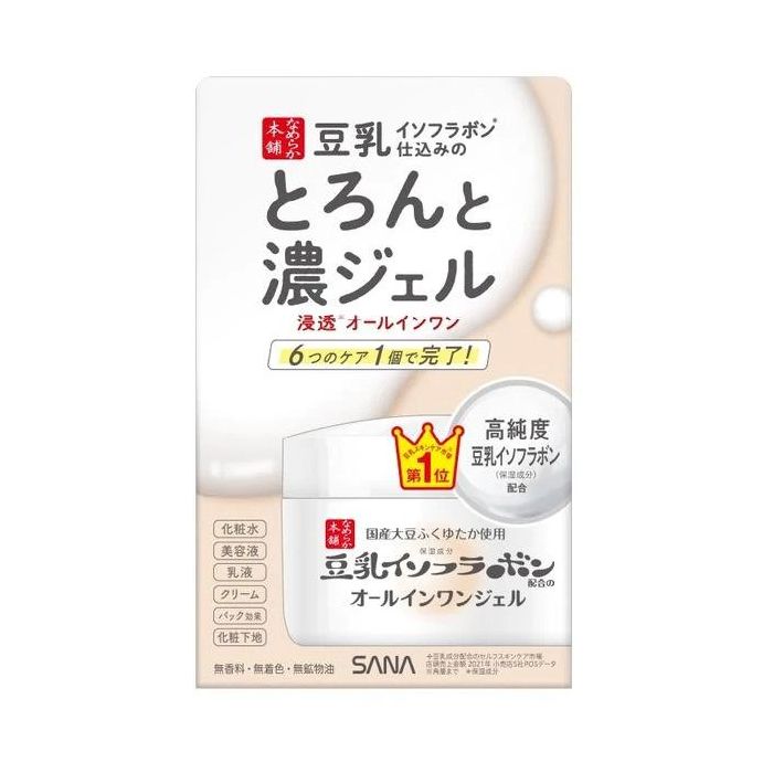 A moisture-rich gel offers lasting softness and combines six benefits in one product (toner, beauty essence, emulsion, cream, moisturizing mask, and makeup base). Enriched with soybean extract soymilk, it locks in moisture, leaving your skin soft and supple, all while being free from fragrances, artificial colors, and mineral oil.