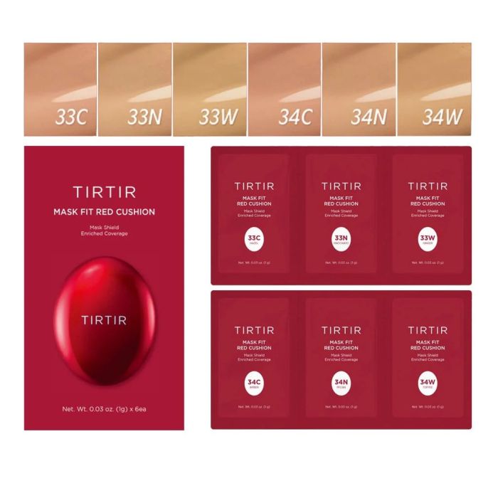 Discover your ideal shade with the TIRTIR Mask Fit Red Cushion 6 Shade Trial Kit. This set features sample pouches of the Mask Fit Red Cushion foundation, offering flawless, long-lasting coverage. Effortlessly concealing imperfections and redness, it leaves your skin with a smooth, radiant finish.